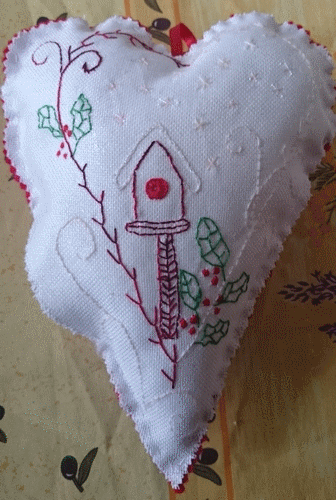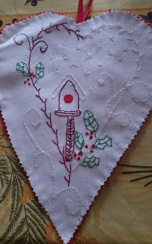 Coeur nichoir en broderie traditionelle sur une toile pailletée. Grille du net. Février 2016.