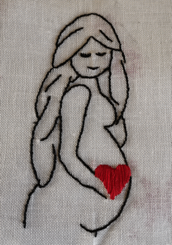 Femme enceinte, point de tige et point lancé. Modèle trouvé sur internet. Pour le cahier de grossesse d' Angélique qui attend notre futur nièce ou neveu. Octobre 2019.