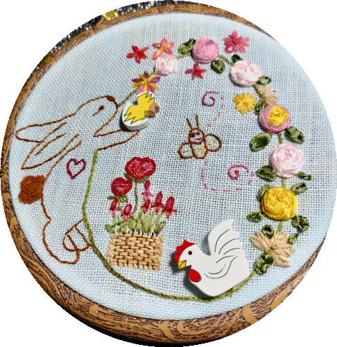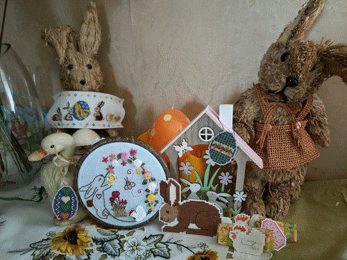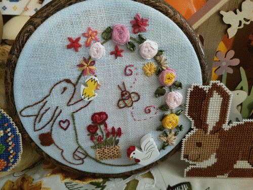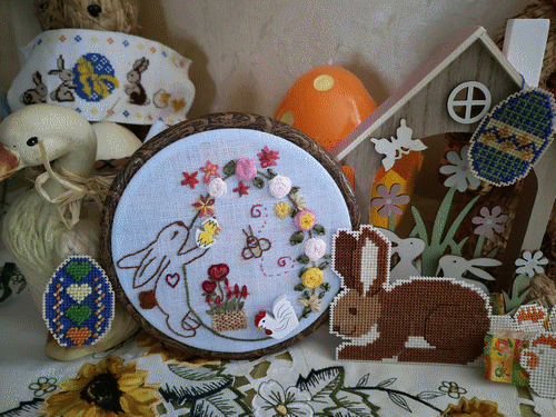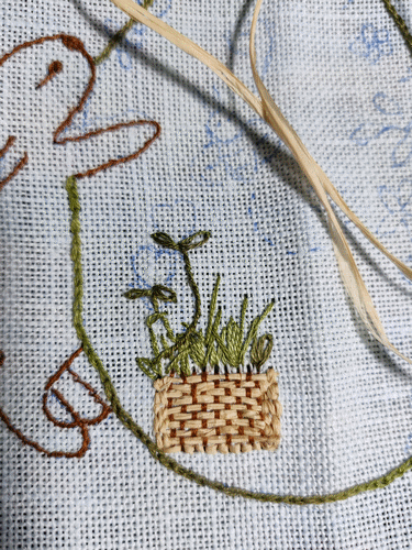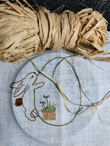 , voici ma participation. Fils DMC et Atalie, sur une étamine bleue pâle. J'ai tissé le panier avec du raphia. Pâques 2022.