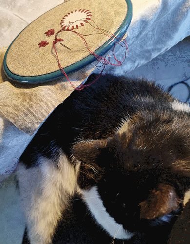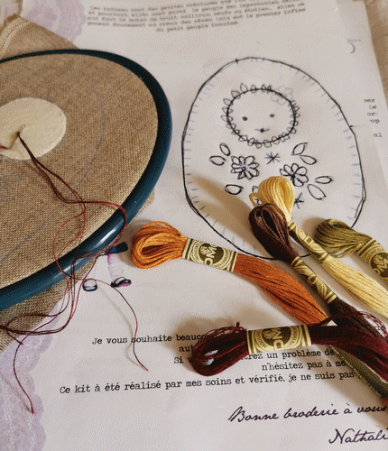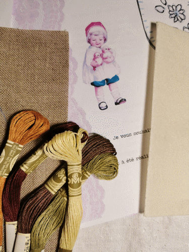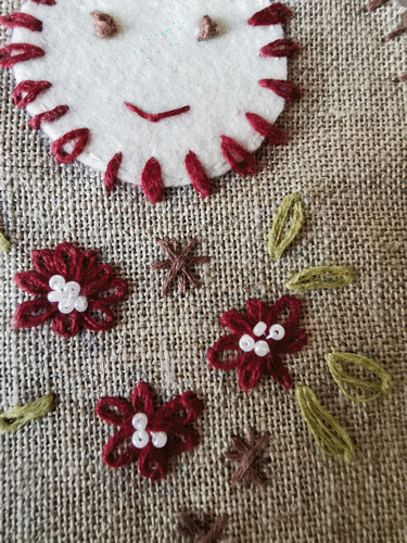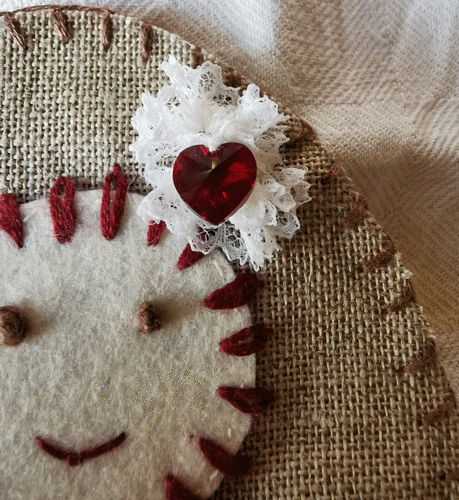 . Un reste de dentelle, que j'ai cousu en cocarde et mis un bijou coeur. Quelques perles. Derrière j'ai mis un morceau de feutrine pour économiser le lin. Mars 2020.
