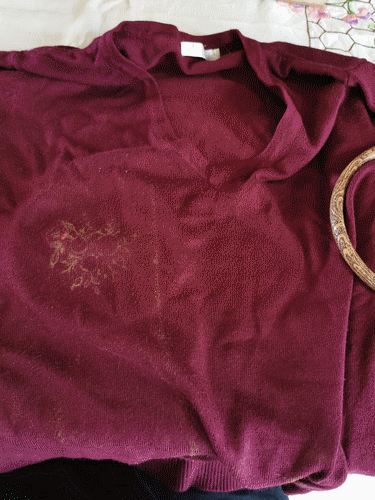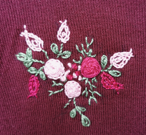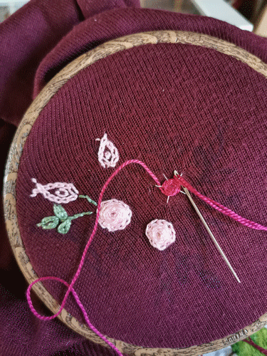 Mon pull neuf et une petite tâche ne partant pas...Pas grave, un modèle de broderie traditionnelle trouvé sur le net, fils DMC...Je trouve le résultat assez sympa. Février 2020.
