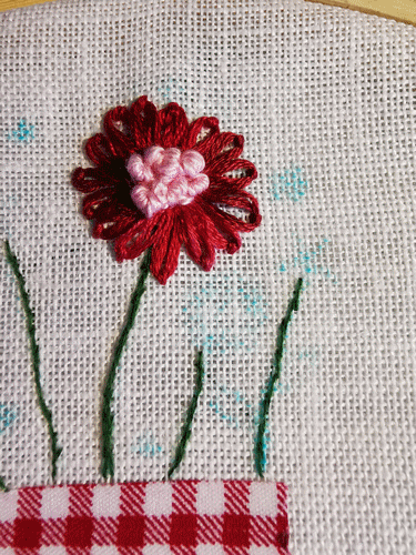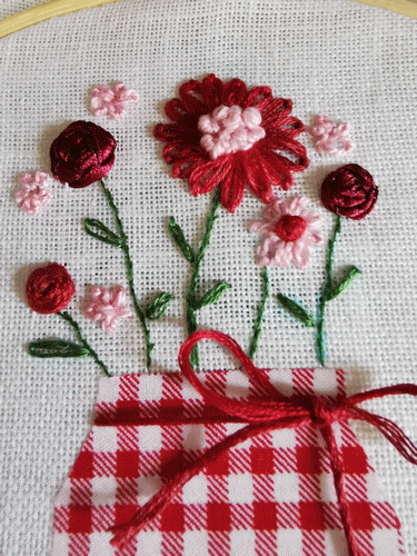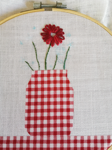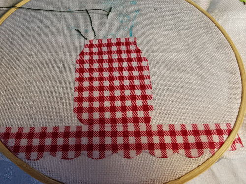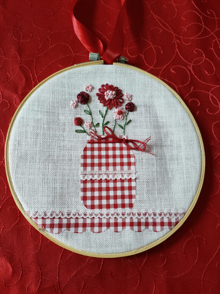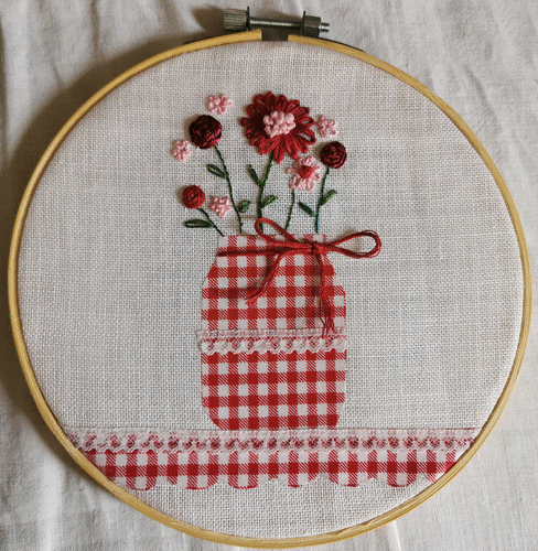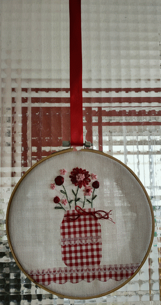 . Tissu adhésif a coller avec le fer à repasser provenant du magasin la Foirfouille. Tambour acheté à Cultura. Fils DMC et coton perlé, rubans et dentelles. Juin 2020.