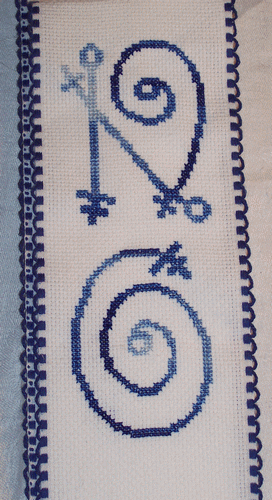 Brodé sur une bande aïda, avec du croquet bleu. Grille gratuite de Souricette. Novembre 2008.