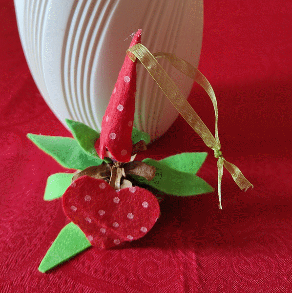 Bébé fraise, créer avec une pomme de pin, une bille en bois et de la feutrine. Mars 2023.