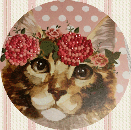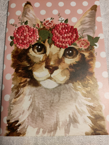 Carte broderie diamand, trouvé à Action. Le chat pour ma fille, Gwendoline. Mars 2021.