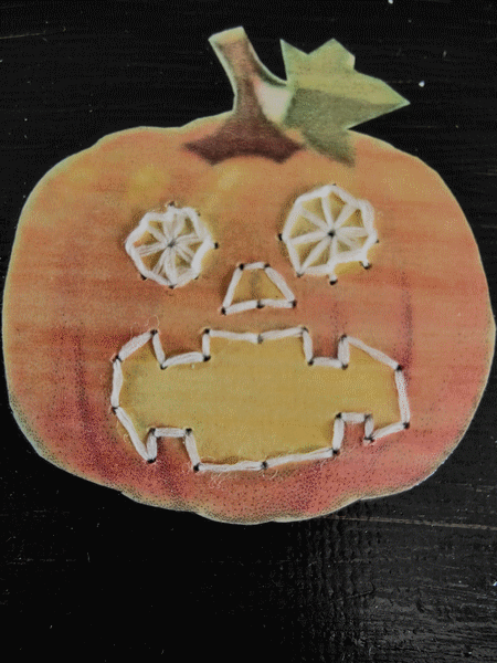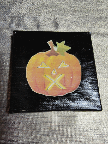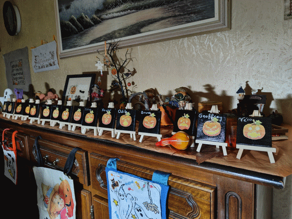 Petits chevalets, achetés à Action. Peints avec de la peinture acrylique noire, citrouilles imprimées, découpées et collées avec de la colle vinylique blanche.