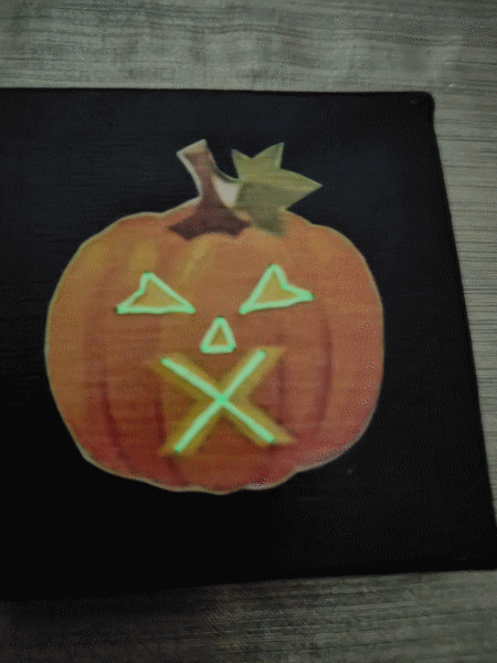 Brodé avec du fil phophorescent. Prénom écrit au feutre or. Octobre 2023.