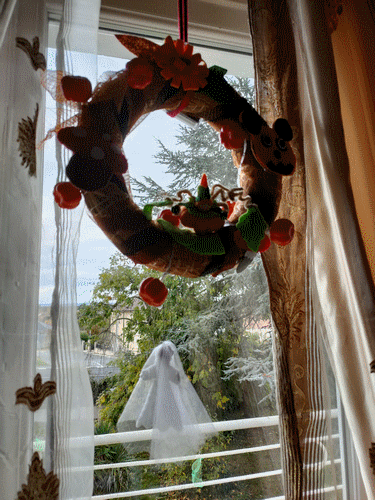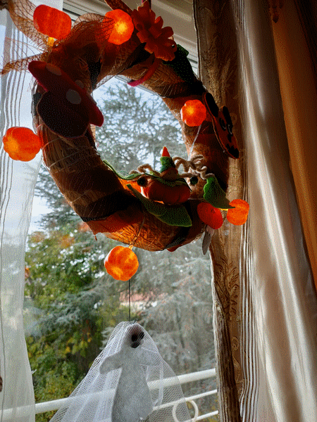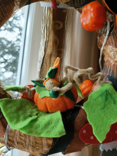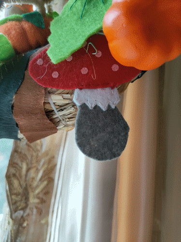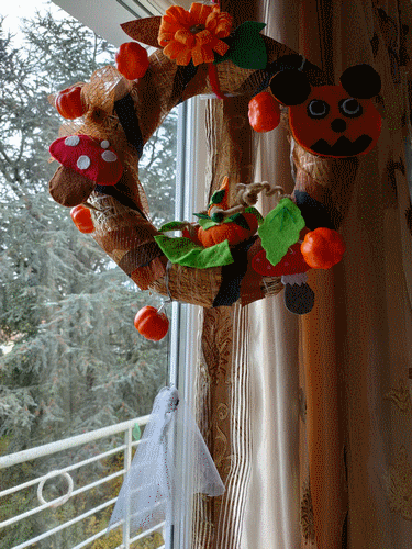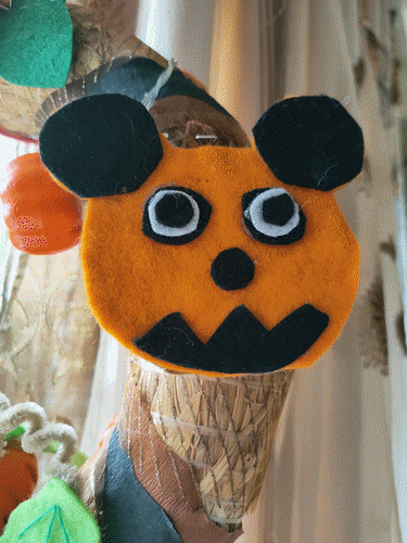 Couronne d'Automne. De la paille, papier crépon, tulle brillant et feutrine. Septembre-Octobre 2021.
