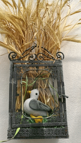 Toujours le même support et un décor d'été...Une peluche mouette et un bouquet de blé (de mon jardin)....Juillet 2017