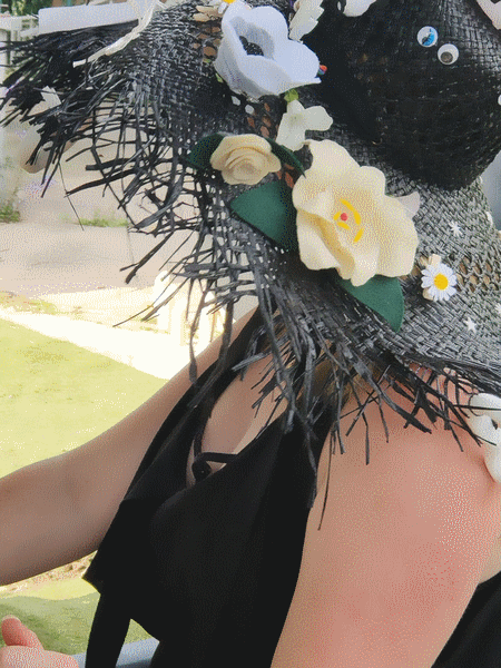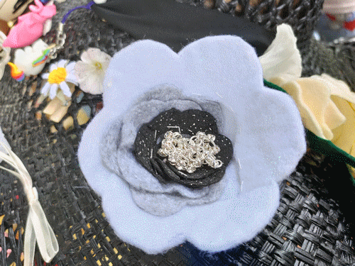 Fleur en feutrine pour le chapeau des 25 ans de ma fille, Gwendoline. Au milieu un bracelet de cheville. Avec tout mon amour. Juin 2021.