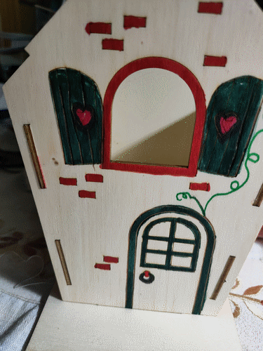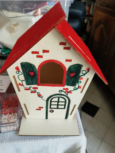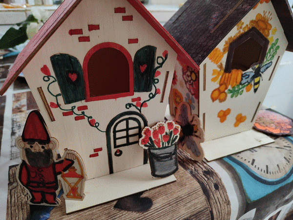Maisons en bois à colorier, achetées à Action. Juillet 2022.