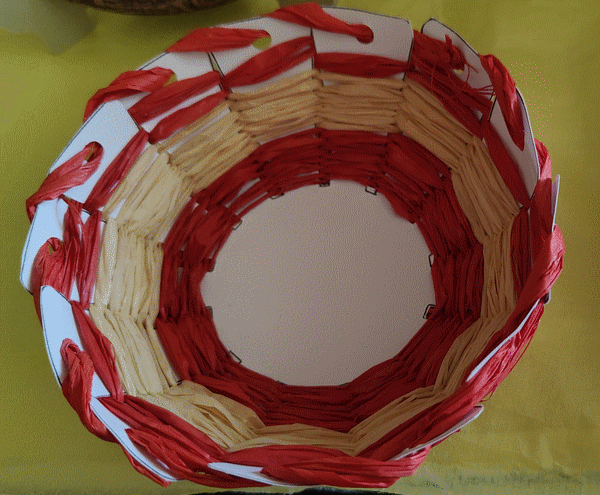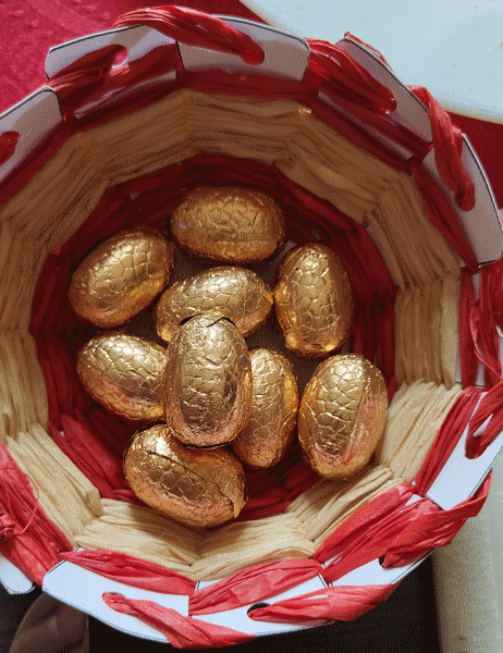 J'ai trouvé l'idée sur internet et j'ai tissé ses paniers avec du raphia, pour mettre mes oeufs de Pâques. Avril 2023.