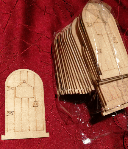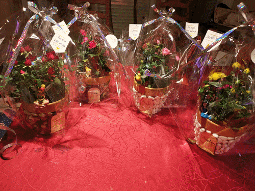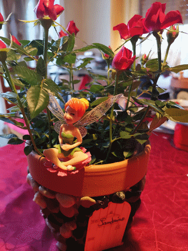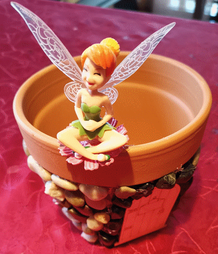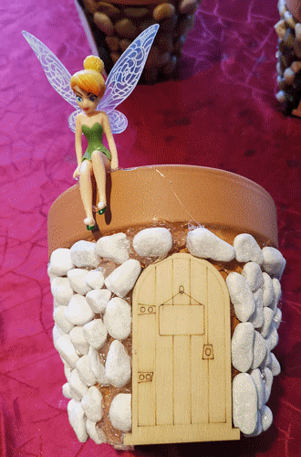 Pots en terre, deguises en maison de fees. Petites portes, cailloux et des fees clochettes.