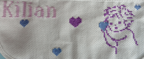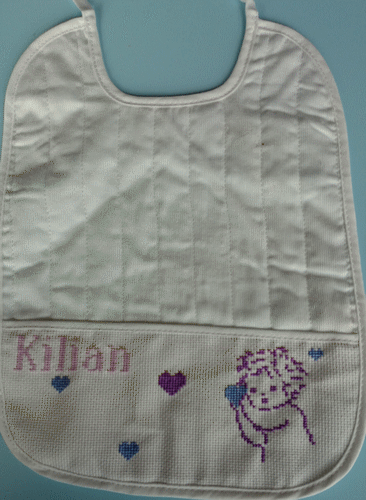 Pour Kilian. Bavoir acheté à Noz. Grille gratuite du net. Octobre 2014.
