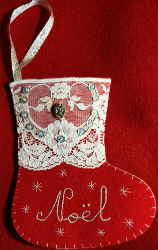 Botte rouge pour l'anniversaire de Thérèse. Dentelles et perles. Décembre 2017.