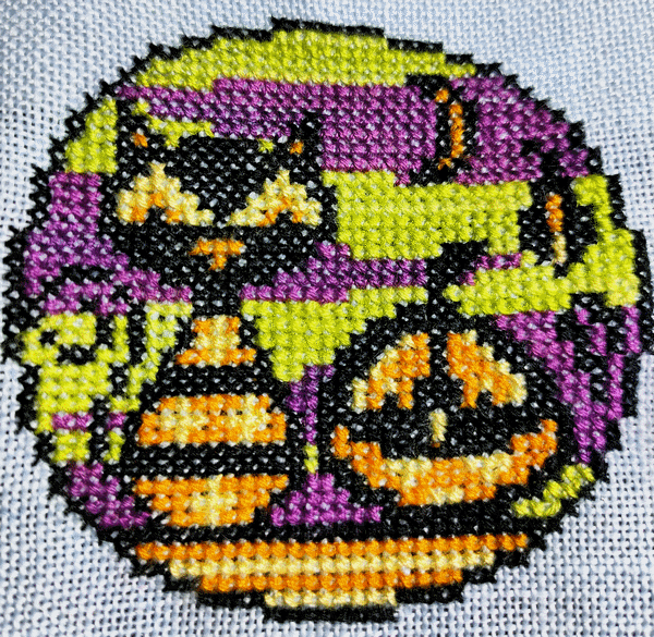 Modèle gratuit de Durene Jones, trouvé sur Facebook. Brodé sur une étamine bleue claire, avec les fils House of Embrodery. Octobre 2022.