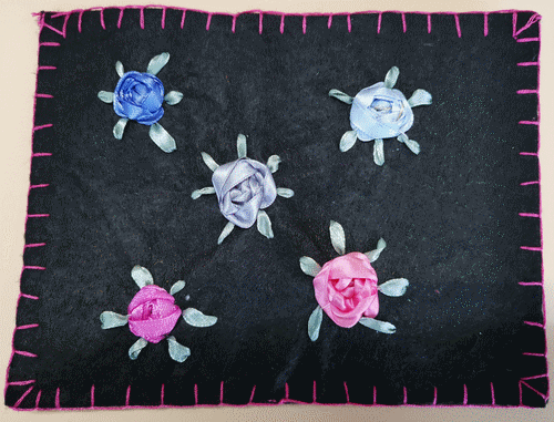 Pour la classe de moyenne section. Pochette de maquillage, feutrine noire et roses avec du ruban. Juin 2019.
