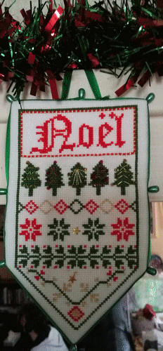 Marque- page Noël, réalisé sur de l'aïda 7 pailletée , fils DMC, monté en pinkeep. Octobre 2009.