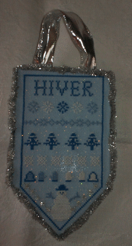 Marque-page hiver, réalisé sur de l'aïda 7 bleue pailletée, monté en pinkeep.Septembre 2009.
