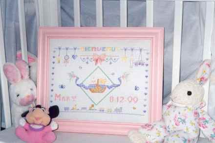 Broderie trouvé sur la revue "Ouvrages et broderie" n° 27 . Réalisé sur aïda 5,5 blanche. Août 1999.