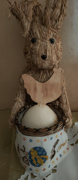Pour décorer un panier en osier dans lequel j'ai mis de la paille verte, un poussin et des oeufs de caille en chocolat.1998.