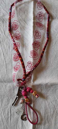 Cordon de couleurs, rubans, perles et un porte clé atsem offert par Lola. Je retrouve toujours mes clés dans mon sac. Septembre 2019.