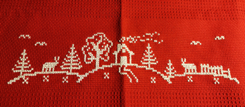 Torchon rouge, brodé en blanc. Décembre 2019.