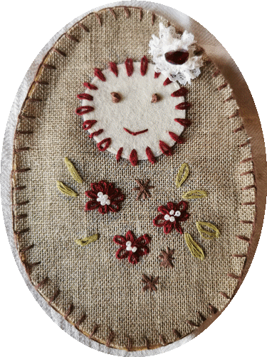 . Un reste de dentelle, que j'ai cousu en cocarde et mis un bijou coeur. Quelques perles. Derrière j'ai mis un morceau de feutrine pour économiser le lin. Mars 2020.