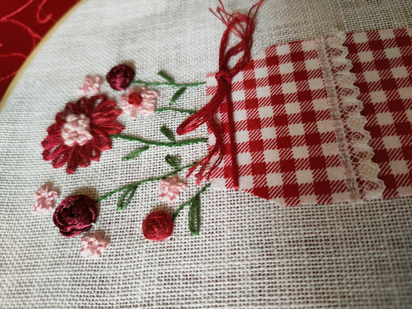 . Tissu adhésif a coller avec le fer à repasser provenant du magasin la Foirfouille. Tambour acheté à Cultura. Fils DMC et coton perlé, rubans et dentelles. Juin 2020.