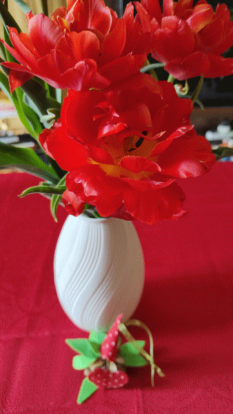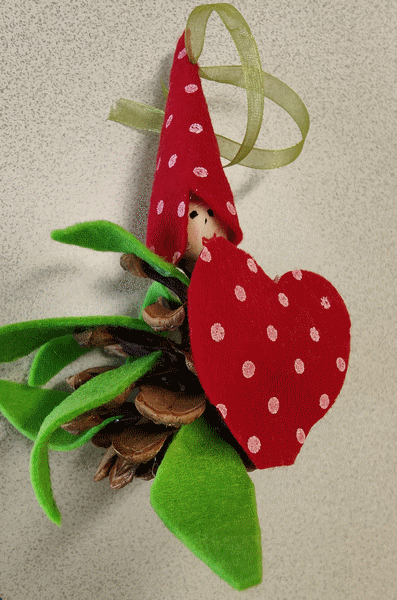 Bébé fraise, créer avec une pomme de pin, une bille en bois et de la feutrine. Mars 2023.