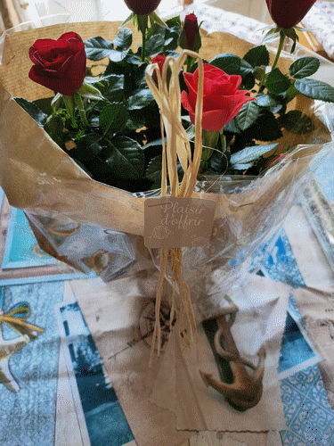 Pour Sandrine et Yannick, un emballage papier craft et papier cristal, ainsi que du raphia. Août 2021.