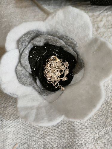Fleur en feutrine pour le chapeau des 25 ans de ma fille, Gwendoline. Au milieu un bracelet de cheville. Avec tout mon amour. Juin 2021.