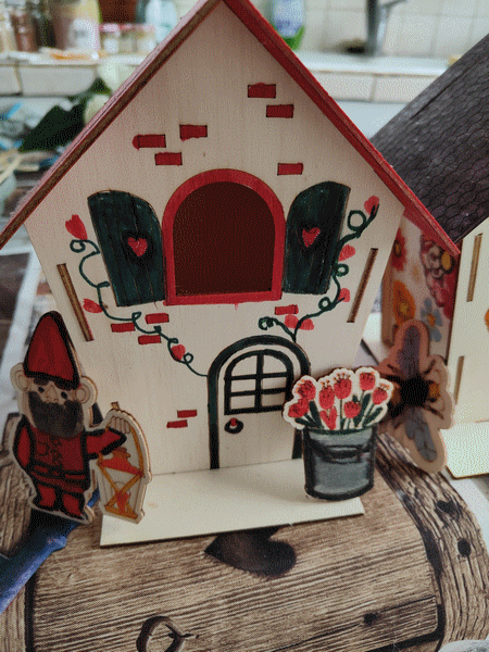 Maisons en bois à colorier, achetées à Action. Juillet 2022.