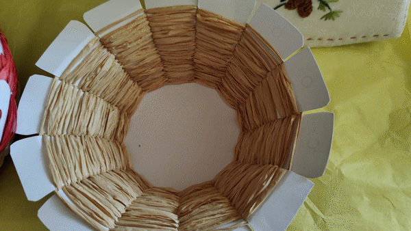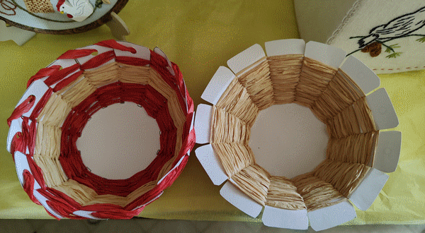 J'ai trouvé l'idée sur internet et j'ai tissé ses paniers avec du raphia, pour mettre mes oeufs de Pâques. Avril 2023.