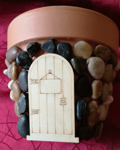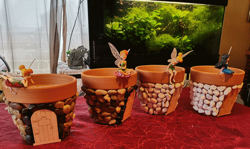 Pots en terre, deguises en maison de fees. Petites portes, cailloux et des fees clochettes.