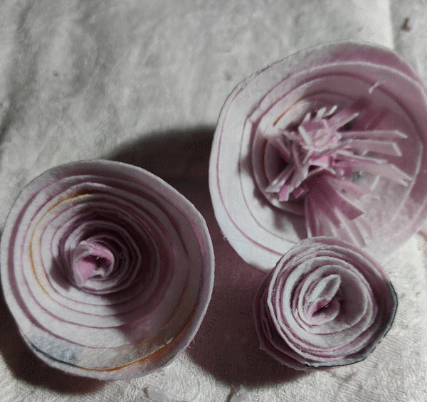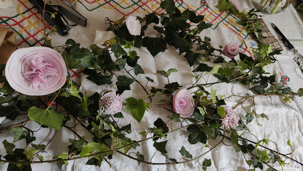 Fleurs en feutrine. Feutrine que Bruno m'avait ramené, fleurs et lierres pour décorer ma salle à manger. Avril 2024.