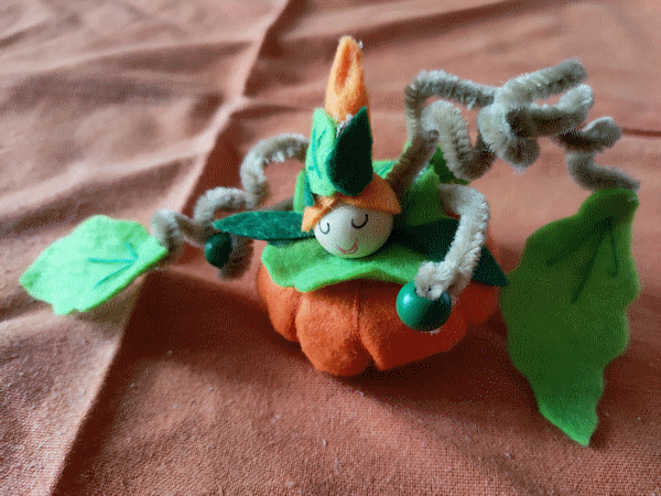 Bébé citrouille en feutrine, d'après une vidéo de CreativeMamy vue sur Facebook. Octobre 2021.