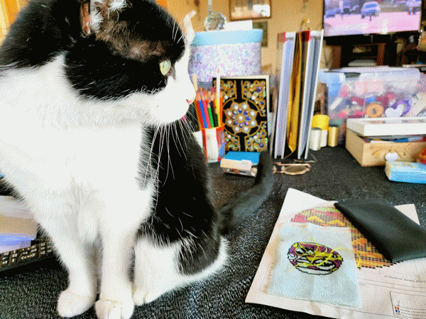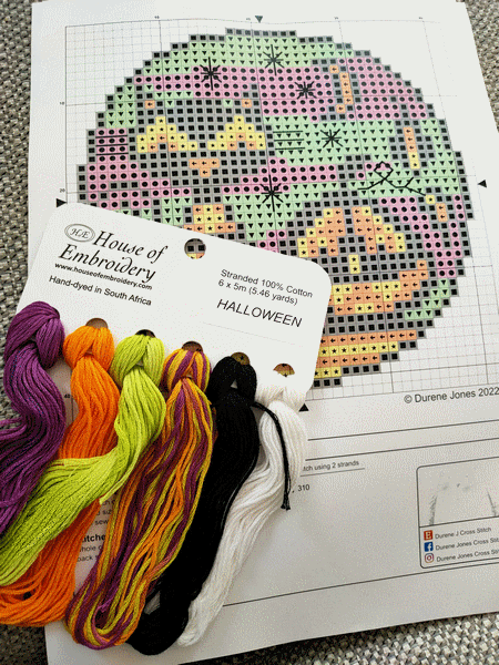Modèle gratuit de Durene Jones, trouvé sur Facebook. Brodé sur une étamine bleue claire, avec les fils House of Embrodery. Octobre 2022.