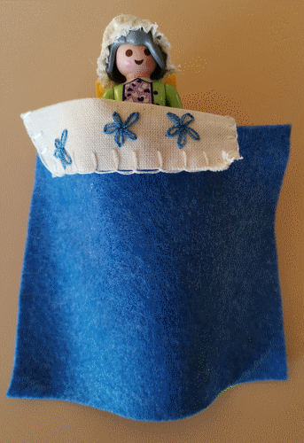 Costume du petit chaperon rouge, aussi une charlotte, drap et couverture pour la grand-mère playmobils-légos. Mars 2019.