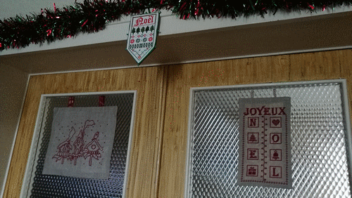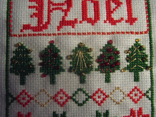 Marque- page Noël, réalisé sur de l'aïda 7 pailletée , fils DMC, monté en pinkeep. Octobre 2009.
