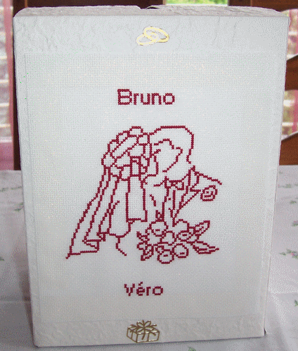 Pour décorer l'urne de mon mariage.Réaliser sur une aïda blanche pailletée, avec le 498 de DMC. Mai 2009.