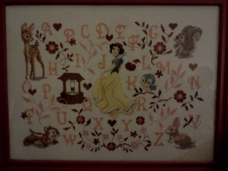 Pour l'anniversaire de ma nièce, tableau DMC Blanche-Neige. Juin-Juillet-Aout 2012